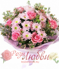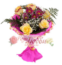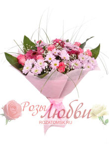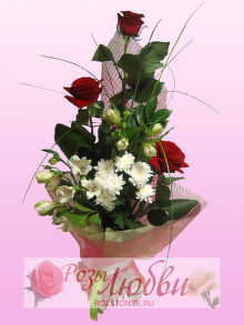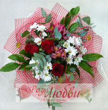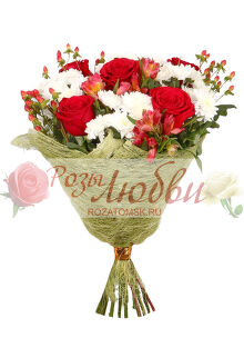 №62. Букет из 3 роз, кустовой хризантемы и альстромерий в упаковке из сетки и фетра.