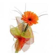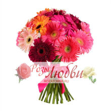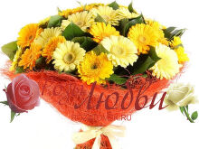 №158 Яркий букет из 31 герберы с зеленью ( рускусом, салалом ) в упаковки из сизали.