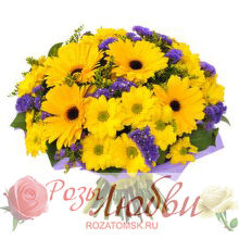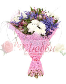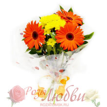 №79. Букет сборный из 5 гербер, 5 хризантем, 5 статиц. Оформлен зеленью в яркой упаковке