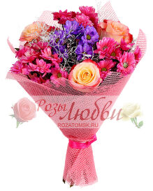 №157 Букет из хризантемы, гвоздик, альстромерий, эустомы, кустовой розы с зеленью.