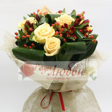 №18. Букет из белых роз (5 шт.) и альстромерий (3 шт.), гиперикума и зелени.