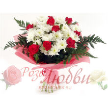 №89. Букет из 15 роз, 8 кустовых хризантем, с зеленью папоротника. Красивое оформление