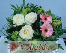 №75. Необычно красивый букет из роз и гербер и хризантем с большим количеством зелени.