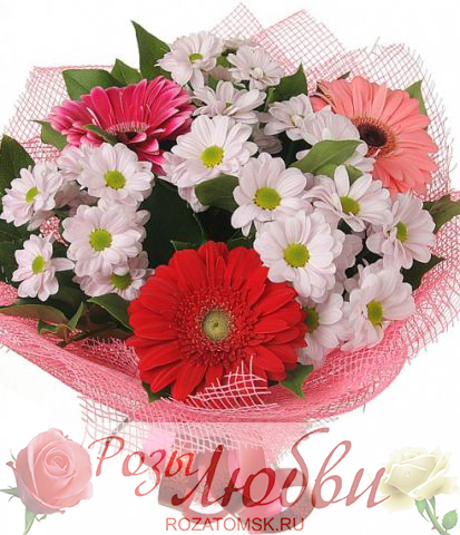 Букет из 3 гербер и 4 хризантем с зеленью в красивой упаковке.