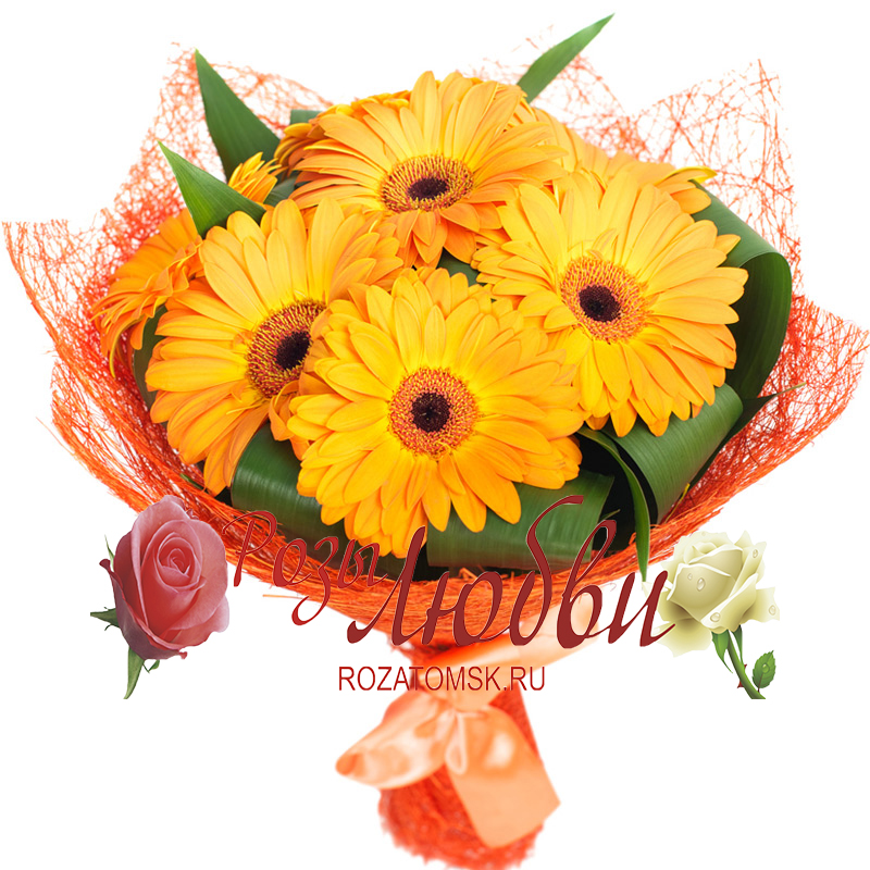 Букет из 7 ярких гербер с аспидистрой в сизали.