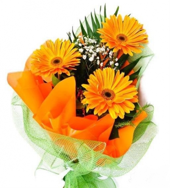 Букет из 3 шт. Герберы с гипсофилой и упаковкой пленка
