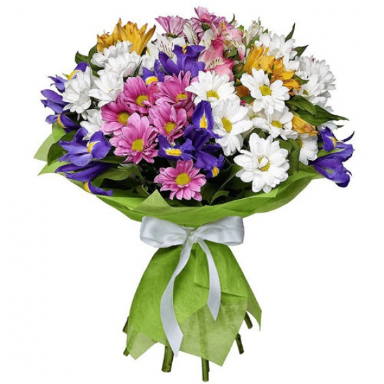 Букет из разных хризантем 5 шт, 3 альстромерий и 5 ирисов.