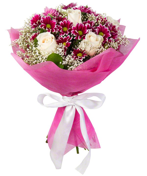 №182 Букет из белой розы 5 шт. кустовых хризантем 4 шт. и гипсофила 2 шт.