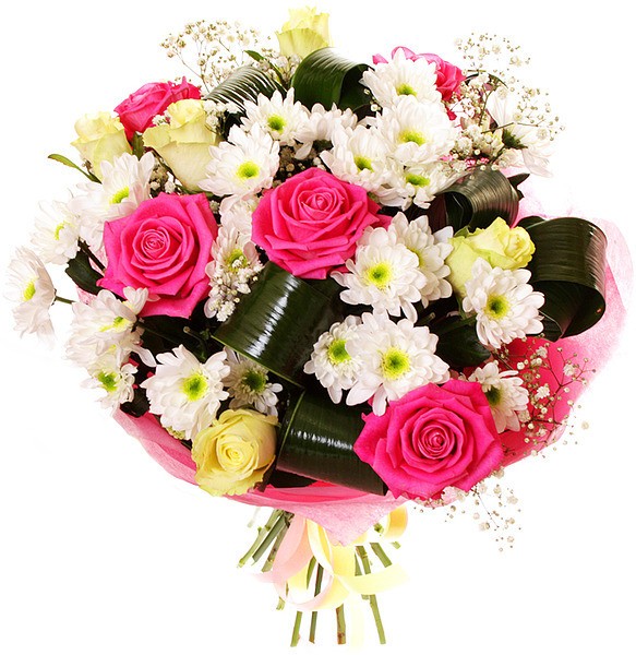 Букет из 6 роз,5 хризантем,гипсофилы,зелени,упаковки.