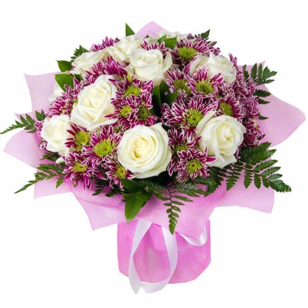 Букет из 7 роз и 4 хризантем + зелень и упаковка.