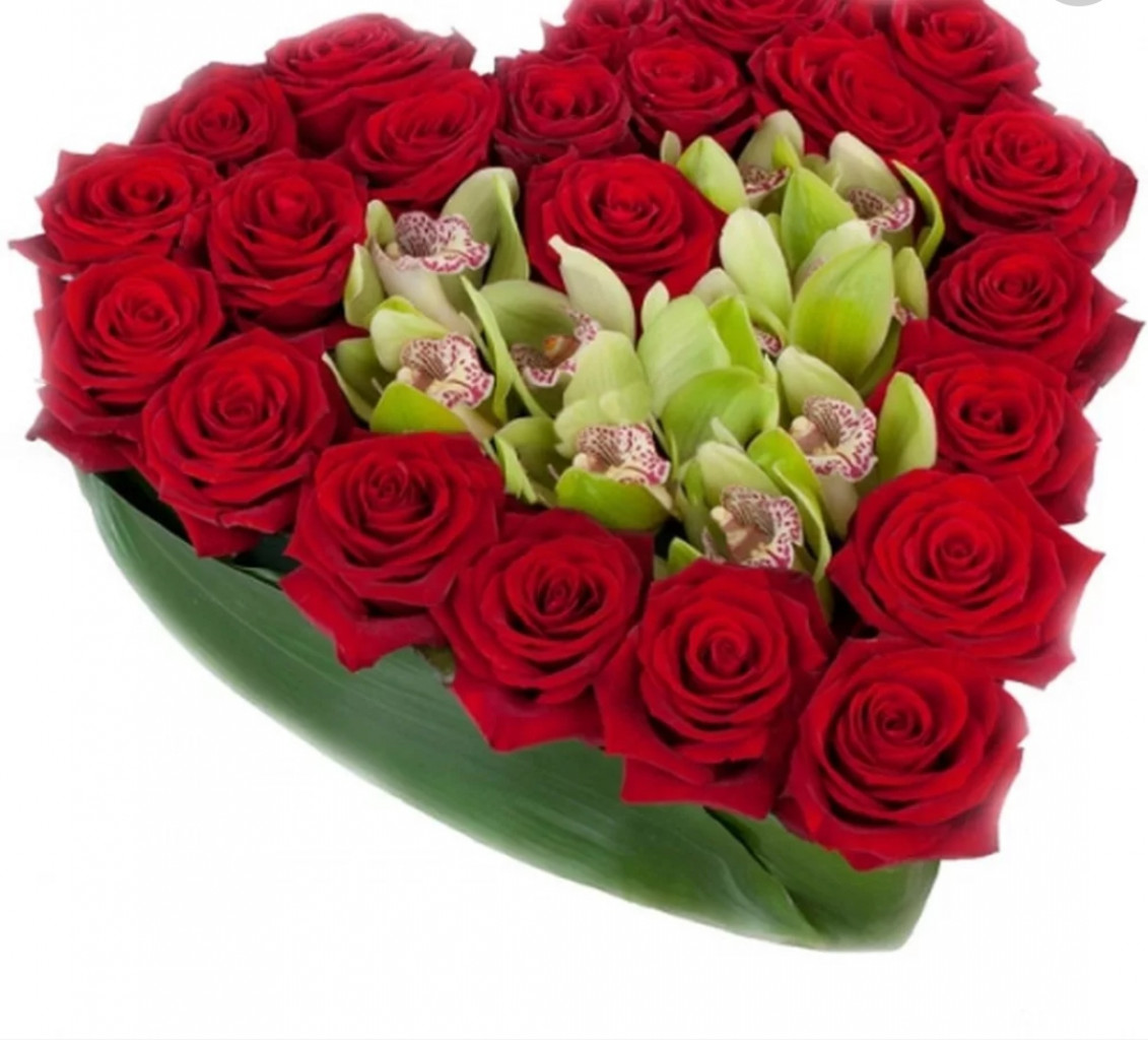 Красивая композиция в форме Сердце из 25 красных роз и орхидеи.