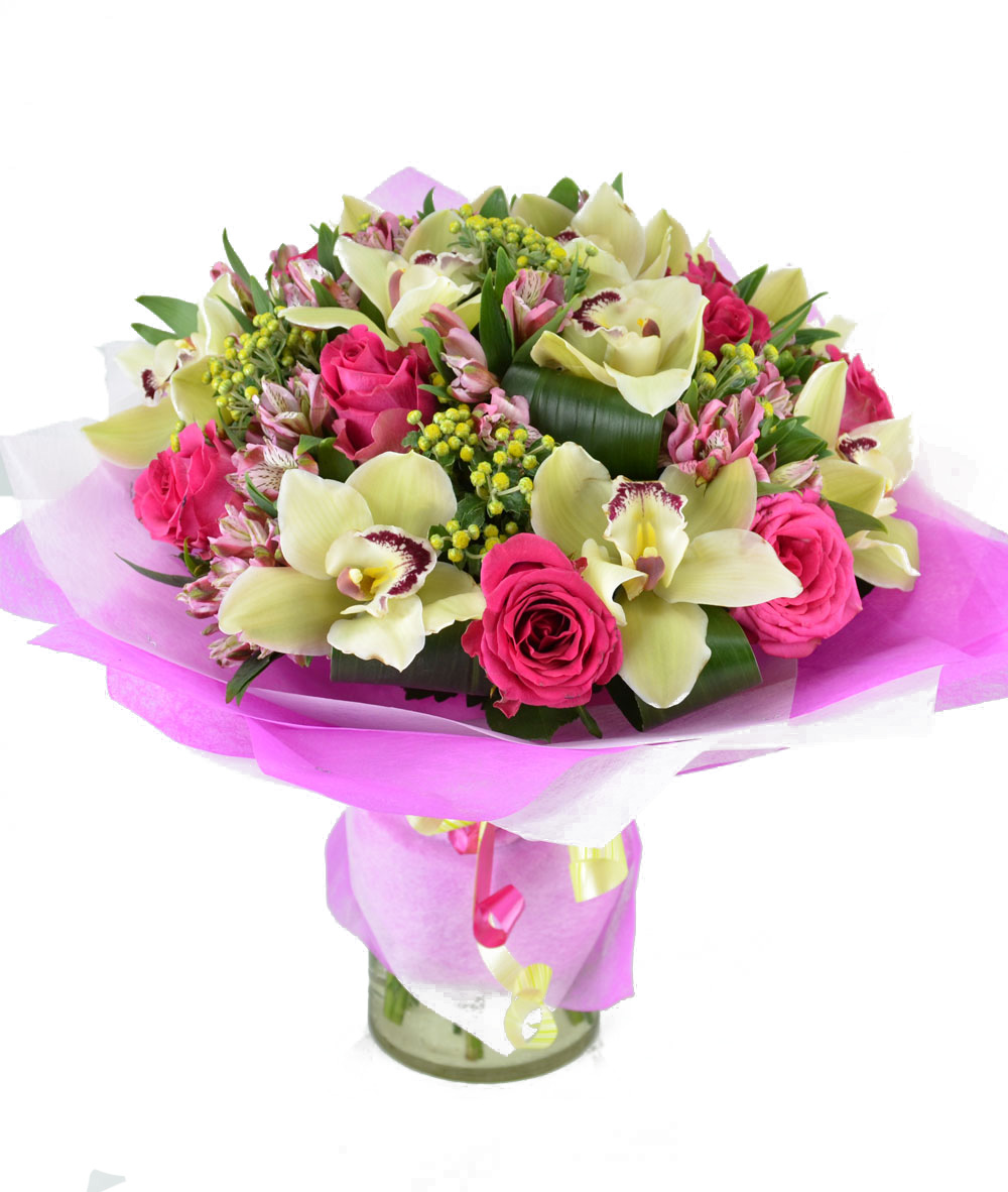 Букет Сборный Большой из розы и орхидеи с добавлением зелени.