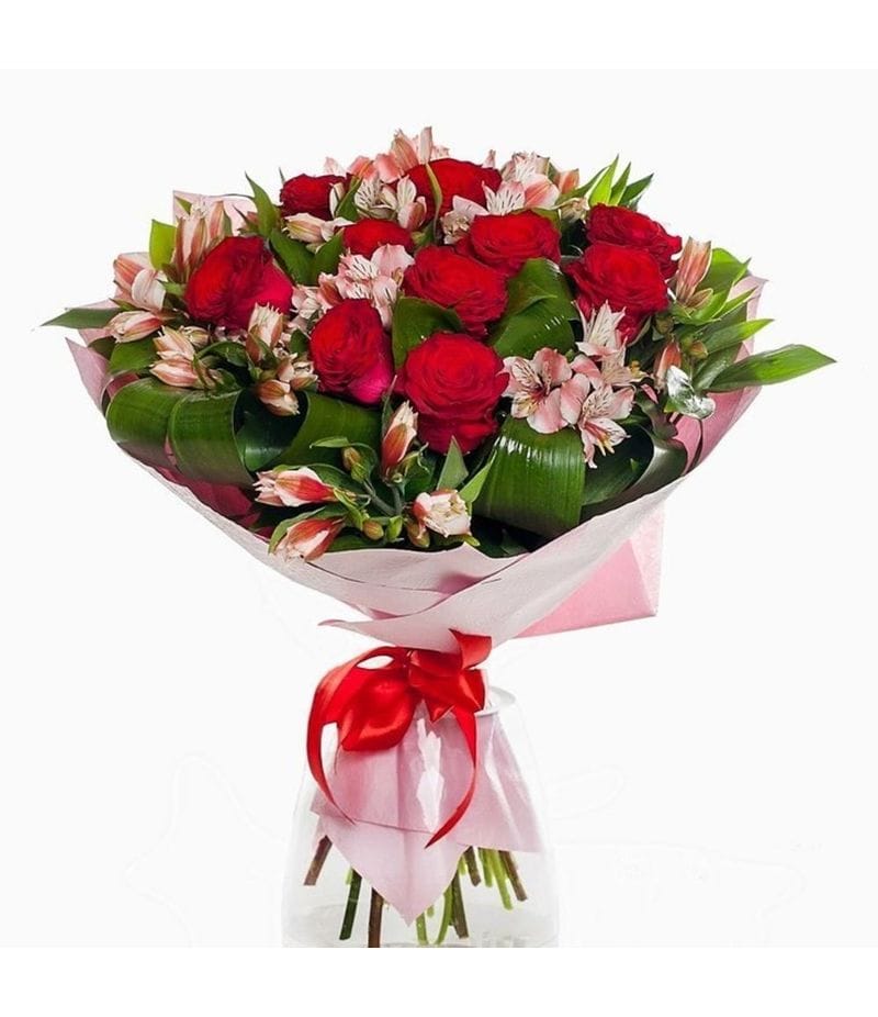 Букет №466 из 15 красных роз и 10 альстромерий — роскошный подарок