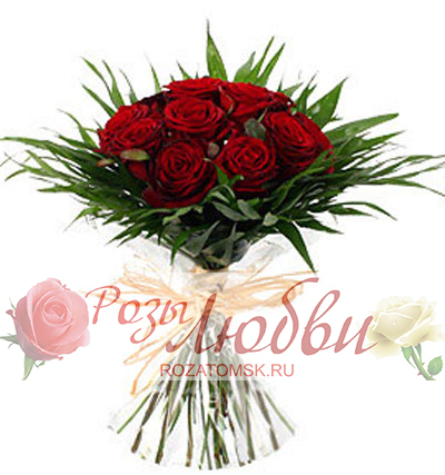 Букет из 9 роз с зеленью пальмы и простой, но эффектной упаковке с бантом.
