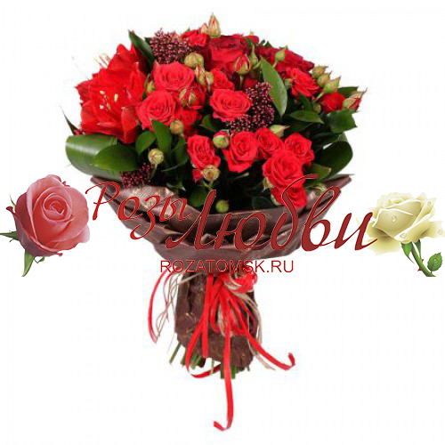 Букет из 5 шт. Алых роз и 6 шт. Алых кустовых роз с зеленью.