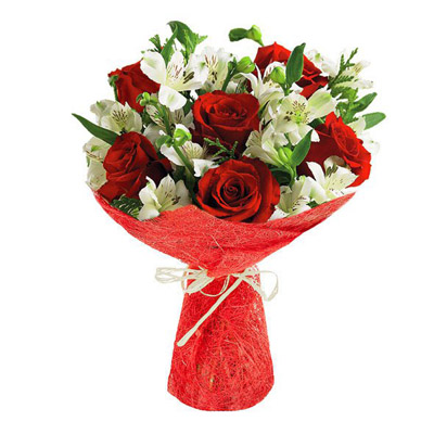 Букет из 7 красных роз и 4 белых альстромерий.