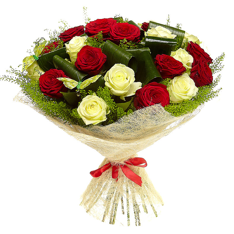 Букет из 21 красно-белой розы высотой 50 см. с добавлением зелени с красивой упаковкой, в красивом исполнении.