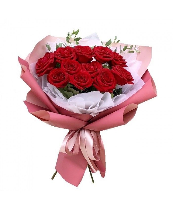 Букет из 11 красных роз с зеленью в красивой упаковке.