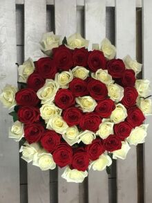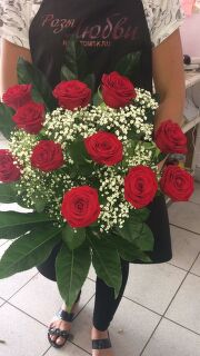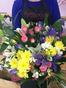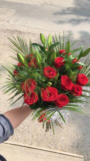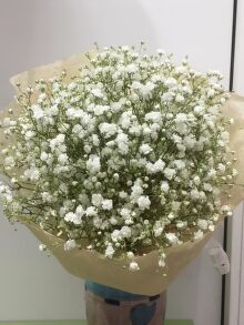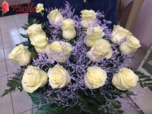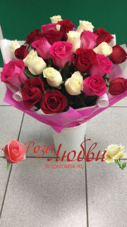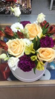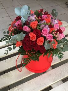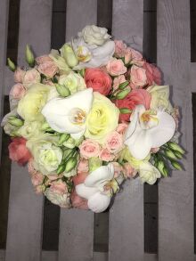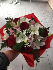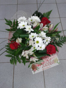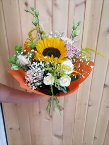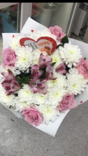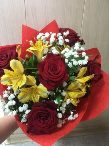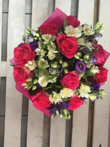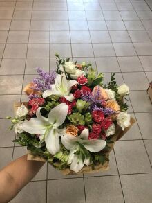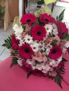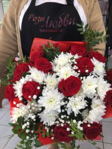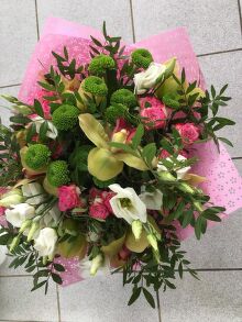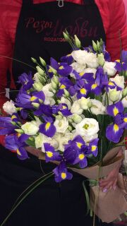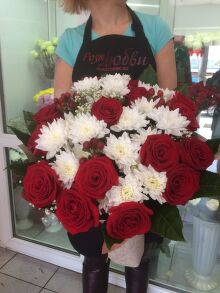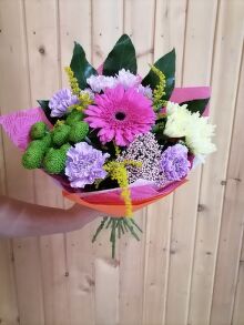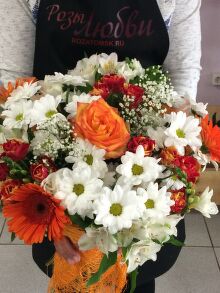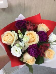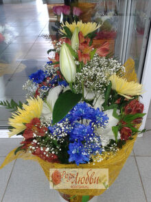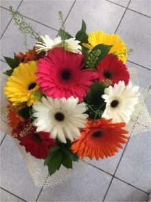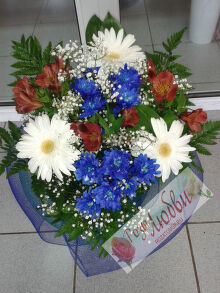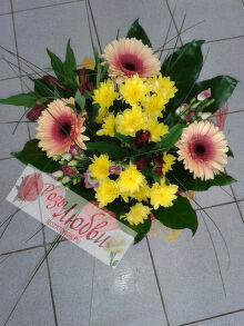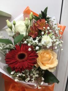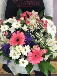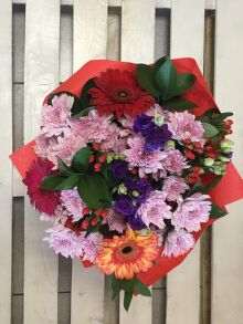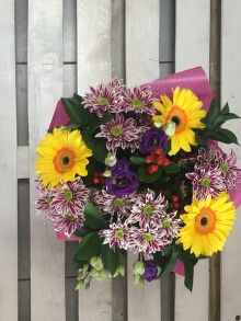 № 303 Букет 3 герберы 4 хризантемы 2 эустомы рускус 3 оформление 1 ветка гиперикума.