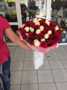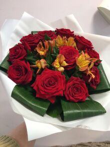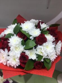 № 304 Букет 4 герберы 4 хризантемы 2 гиперикума 2 эустомы 5 рускуса оформление.